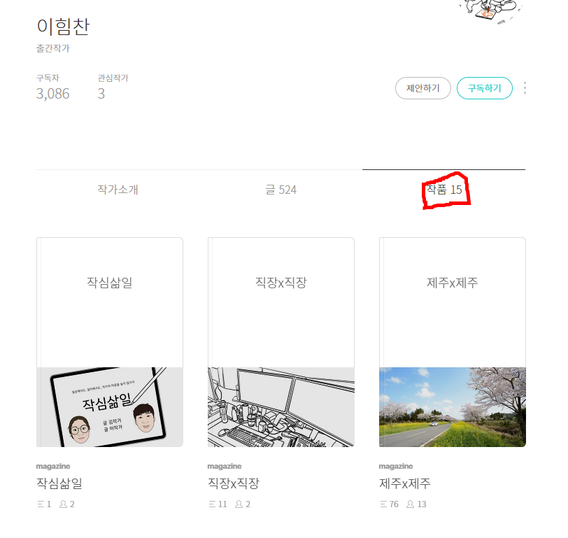 작가님들마다 저렇게 작품이 있는 것이였다. '헛' 모든 작가들이 한 가지 주제로 계속 글을 발행하고 있는 줄 알았는데 저렇게 작품이라는 걸로 쓰고 싶은 내용을 구분해서 나눠 놓은 것을 알게 되었다. 인스타도 블로그도 유튜브도 구독을 참 많이 눌러놨었는데, 미션을 하면서 내 브런치를 보니 구독하는 작가가 거의 없음 또한 오늘 알게되었다.
