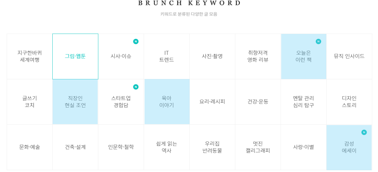 브런치 모바일앱으로만 들여다보다가 가이드 확인 후 PC버전으로 확인해보니 정말로 브런치 키워드 탭이 있었다. 내가 쓰고 싶은 키워드를 하늘색으로 표시해보았더니,