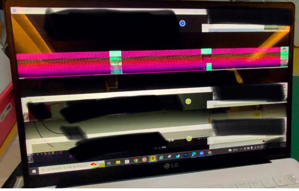 오늘 구매대행 강의 2번째 날, 줌 강의를 노트북으로 들으려고 사무실에서 들고 나와 버스정거장까지 뛰었다가 집에 와서 줌을 켰는데, 화면이 깜빡이며 살짝 흔들리는 것 같더니 빨갛고 노란 선들로 화면 식별이 거의 불가능했다.