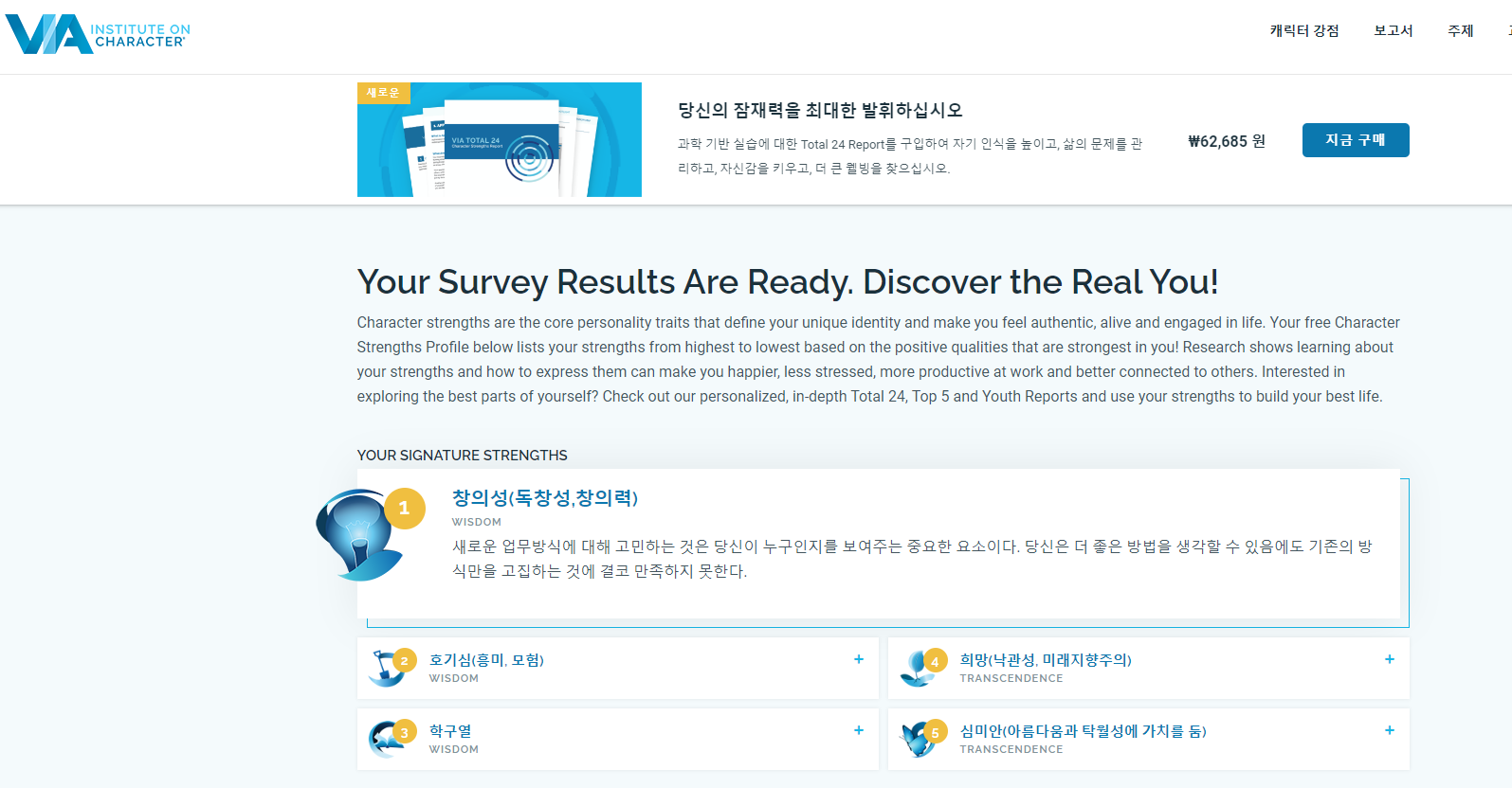 오늘 미션전에 나의 강점테스트를 해보았다.