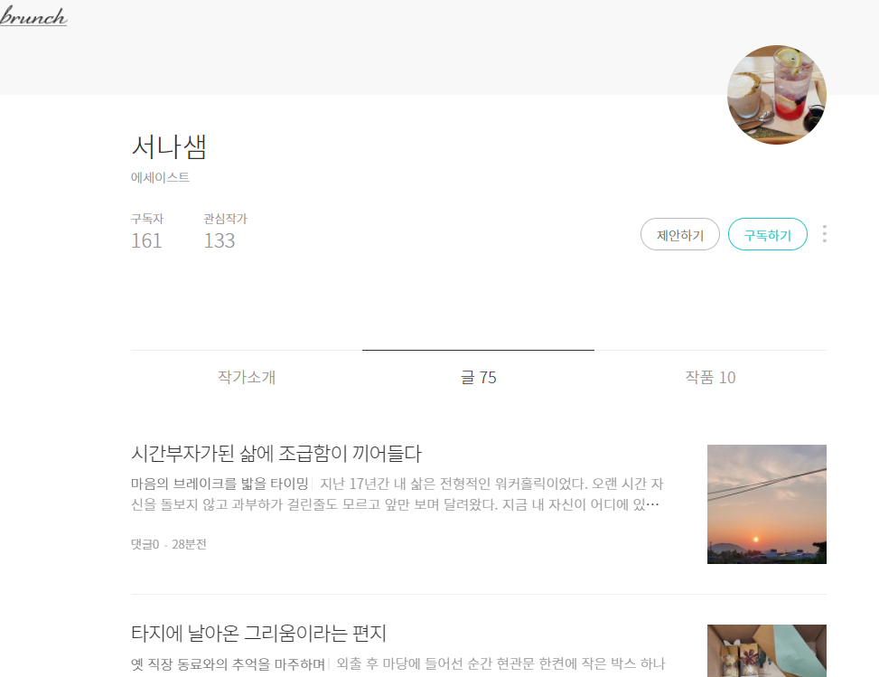 한 달 어스를 시작하고 10일 동안 미션을 하면서 한 시간 안에 끝내 본 적이 없다. 금방 할 줄 알았던 미션들이 이것저것 생각을 하게끔 만들어서 찾고, 읽고, 보고, 생각하고, 글을 쓰고, 다듬고 나면 2~3시간은 훌쩍 지나 있었다. 작가를 위주로 글 전체를 보다 보니 한 두 개의 글이 맘에 들어 구독 버튼을 눌러 놓은 게 꽤 많다는 걸 알게 됐다. 거의 유튜브처럼 구독 버튼을 남발하여 정작 보고 싶은 채널 기억도 안나 못 찾게 되는 그 짓을 할게 너무 뻔해 보였다.