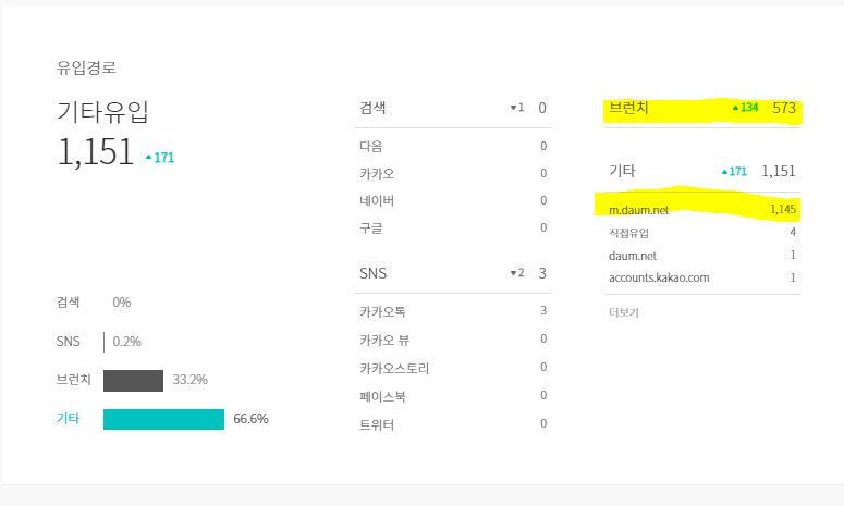 아래는 pc에서 본 유입수. 알고보니 모바일 다음에서의 유입이 1,145. 브런치 내에서는 573 정도?