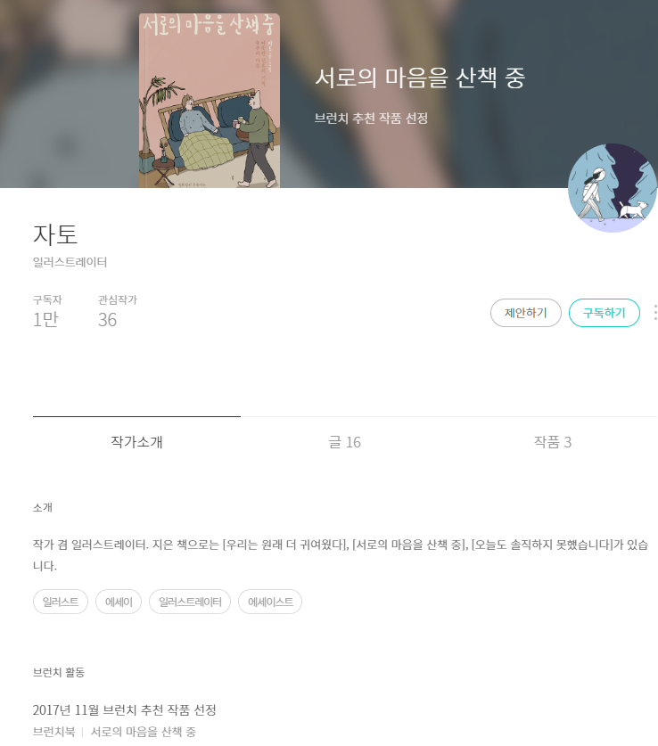 브런치북을 나름 찾아보려 애썼지만 아직 못 찾아서 가이드에 있는 브런치 북을 찾아 들어갔는데...... 와.. 글이 많지 않은데도 구독자수가 저렇게도 나올 수 있구나. 생각했다. '공감을 주는 글' 세월이 지나도 많은 공감을 줄 수 있는 그런 글을 언젠가 쓸 수 있기를.