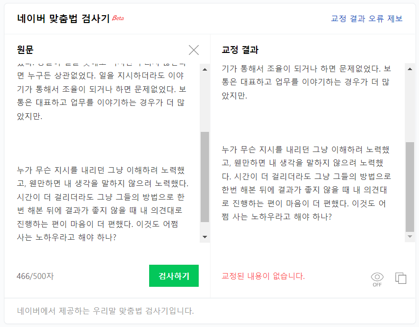 같은 내용을 네이버 문법 교정기에 넣었을땐 아래와 같이 교정할 부분을 찾지 못했다.