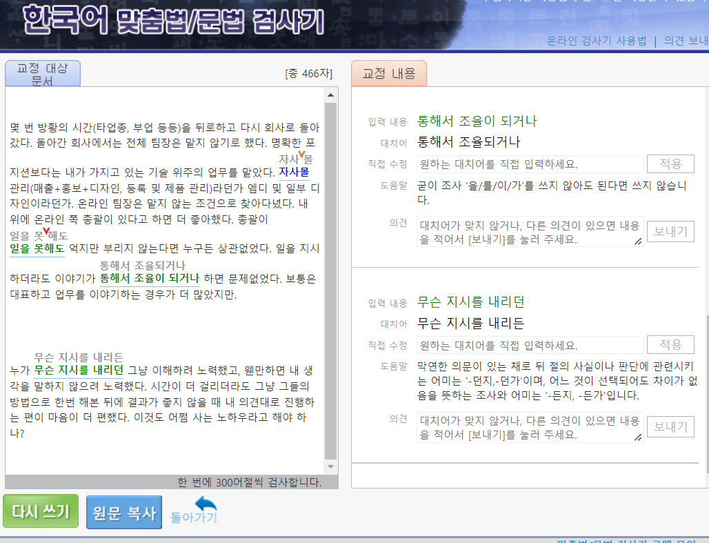 그리고 오늘의 새로운 발견 ..... 충격적이다. 어제 교정관련 링크를 봤을 때, 네이버블로그, 티스토리, 브런치까지 각각의 플랫폼에 교정기능이 있어 건성으로 보고 지나쳤는데 전에 브런치에서 교정봤던 글을 검사기에 넣으니 아래처럼 추가 교정내용이 있었다. 약간의 문법적인 교정까지 검사해주다니 너무 신기했다. 역시 한달어스 참여할 맛이 난다. ㅎㅎㅎ