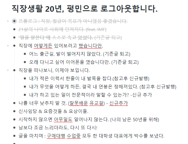 목차를 또 수정할 거라 생각을 못했는데 음.. 역시 끝날 때까지 끝난 게 아닌 것 같다. 예전에 전자책을 쓸 때 목차에 대해 고민하면서 같이 함께하는 챌린져들끼리 당사자를 뺀 해당 인원 전부에게 코멘트를 다는 미션이 있었는데 혼자 하려니 확실히 그때보단 목차 확정이 좀 더딘 느낌이 든다. 그땐 쓰는 글들이 거의 정보성글이라서 그런 코멘트가 가능했던 것 같기도 하다. 아무튼... 목차 재수정.