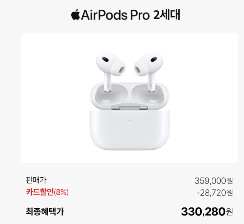 소비자가 359,000원 가격의 에어팟 프로 2세대를 8% 카드할인을 받아 330,280원에 구매할 수 있네요.