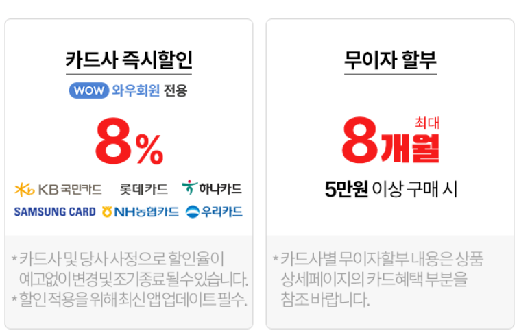 카드사 즉시할인과 무이자할부 최대 8개월이 가능합니다.