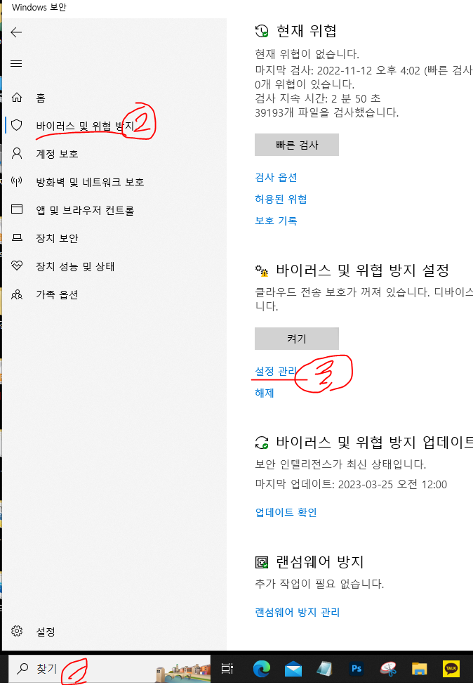 3. 바이러스 및 위협 방지 설정에서 설정관리 선택