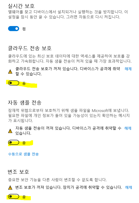 4. 아래 형광으로 칠한 세가지 메뉴를 다 꺼준다. (원래는 실시간 보호를 꺼야하는 것 같은데 다시 켜짐)