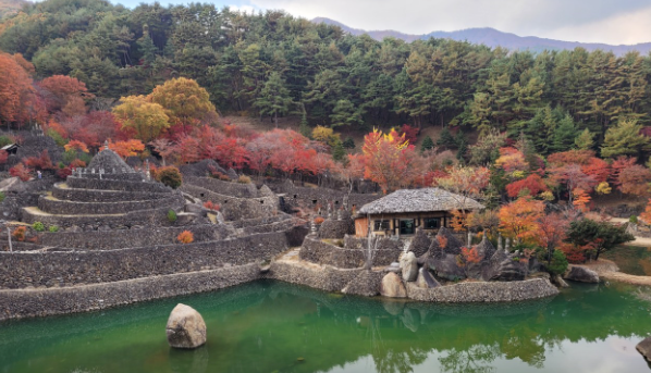 가을 여행지중에서도 꽤 신비로운 곳으로 1983년 이곳 출신 한풀선사가 33만㎡의 터에 하나하나 50년간 돌을 쌓으며 고조선 시대의 소도를 복원한 하동 삼성궁입니다. 입구에서 10~15분 정도 걸어가면 만나게 되는 아름다운 검달길의 첫번째 연못은 가을을 품은 나무와 신비로운 물빛이 이국적이고 신비로운 풍경을 선사합니다.