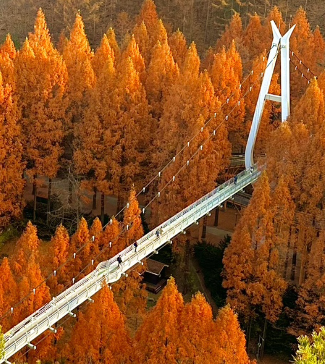 출렁다리 주위로 아름다운 메타세쿼이아 나무들이 멋진 배경이 되어 이국적인 모습을 선사하는데요. 자연 상태의 잡목 숲을 배경으로 평지에 고유 수종인 밤나무, 잣나무, 은행나무 등 유실수, 소나무, 두충 등을 계획적으로 조림했고, 미국에서 들여온 메타세쿼이아, 독일 가문비나무 등 외래 수종을 배열하여 독특하게 조성했습니다.