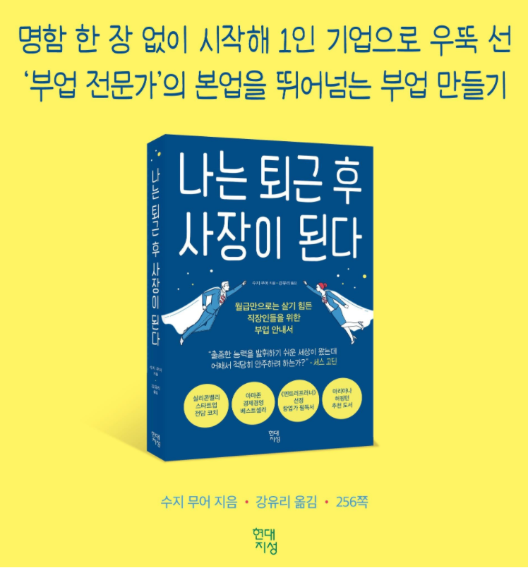 책소개“출중한 능력을 발휘하기 쉬운 세상이 왔는데 어째서 적당히 안주하려 하는가?”월급만으로는 살기 힘든 직장인들을 위한 부업 안내서* 허리 디스크로 걷기조차 힘들던 회사원 매달 1500만 명이 방문하는 건강 사이트 운영자가 되다* 취미로 뜨개질을 하던 주부 온라인 강좌로 억대 수입을 올리다* 출퇴근 열차에서 소설을 쓰던 직장인 베스트셀러 작가가 되다어느 날 아침 사무실에서 문득 심란한 마음이 든다면? 고작 이러려고 이렇게 열심히 살았나 싶다면? 일주일 내내 주말만을 간절히 바라고 있다면? 회사는 싫지만 퇴사는 무서운 직장인들이여 부업을 시작하라! 실리콘밸리 스타트업들의 전담 코치 수지 무어가 안정적인 수입과 원하는 라이프 스타일 두 마리 토끼를 잡는 부업의 비밀을 알려 준다. 맛집을 찾아다니다 파워블로거가 되고 하루 종일 게임을 하다 유명 크리에이터가 되는 시대. 나에게 꼭 맞는 부업 찾기부터 사업 구체화하기 시간 관리 고객 유치 안정적인 수입 올리기 등으로 무장한 『나는 퇴근 후 사장이 된다』는 부업을 시작하려는 당신에게 완벽한 가이드가 되어 줄 것이다. 지금 시작하라! 당신이 꿈꿔 왔던 경제적 자유는 멀지 않은 곳에 있다.