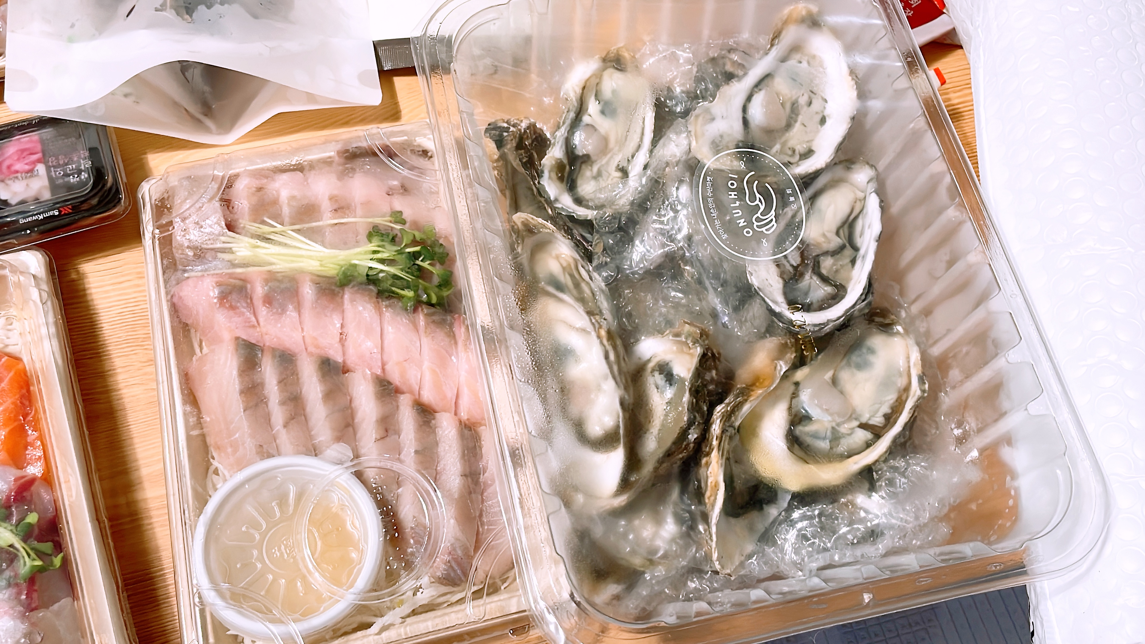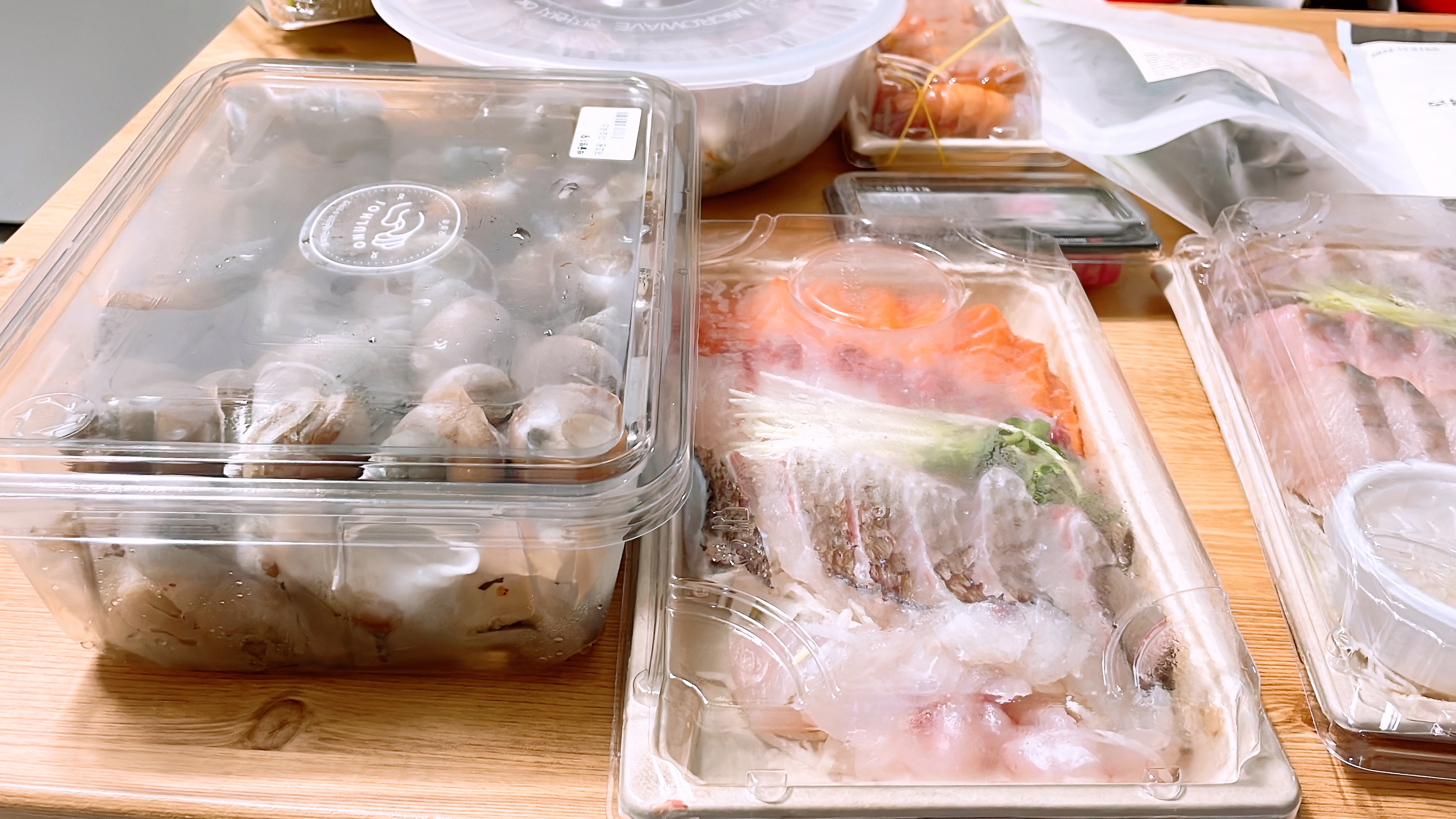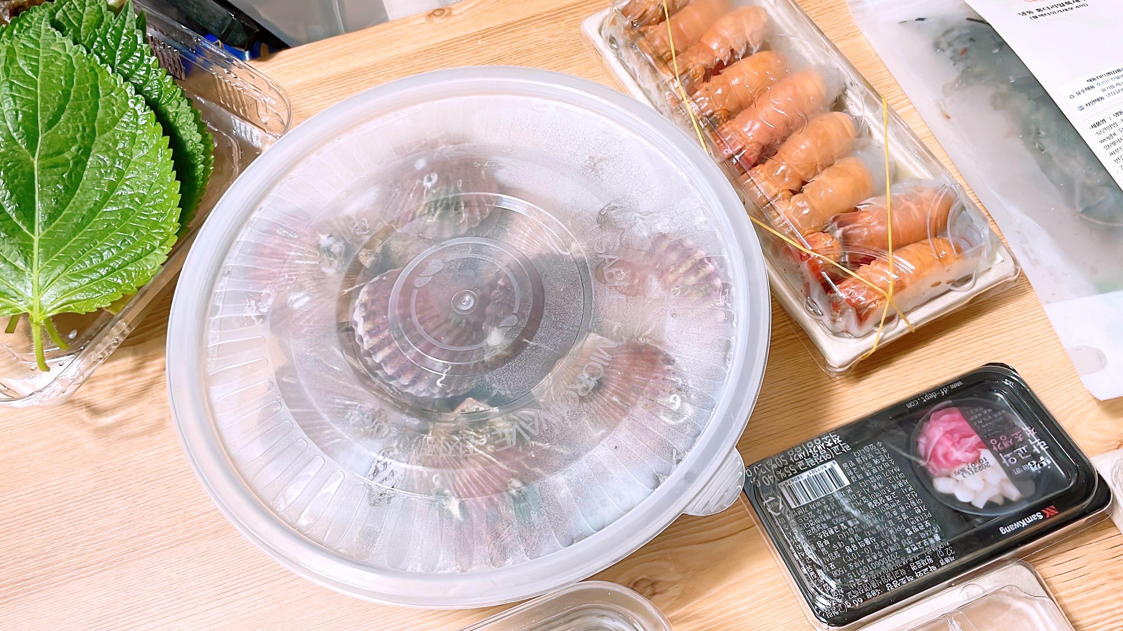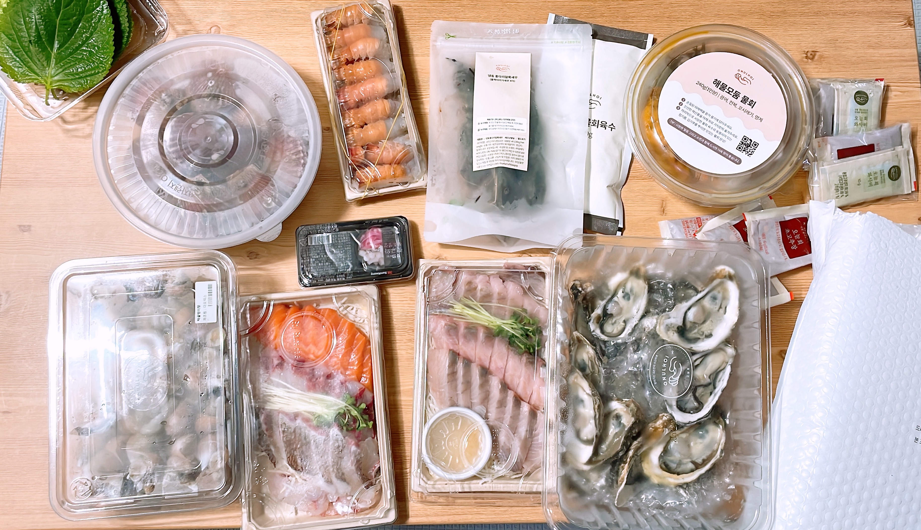 회사갔다가 집에오니 어머니가 겉박스는 까놓으셨더라구요. 식구들이 원체 회를 잘먹기도 하고, 아이도 있어서 조개, 새우까지 열심히 담아봤습니다. ㅎㅎ