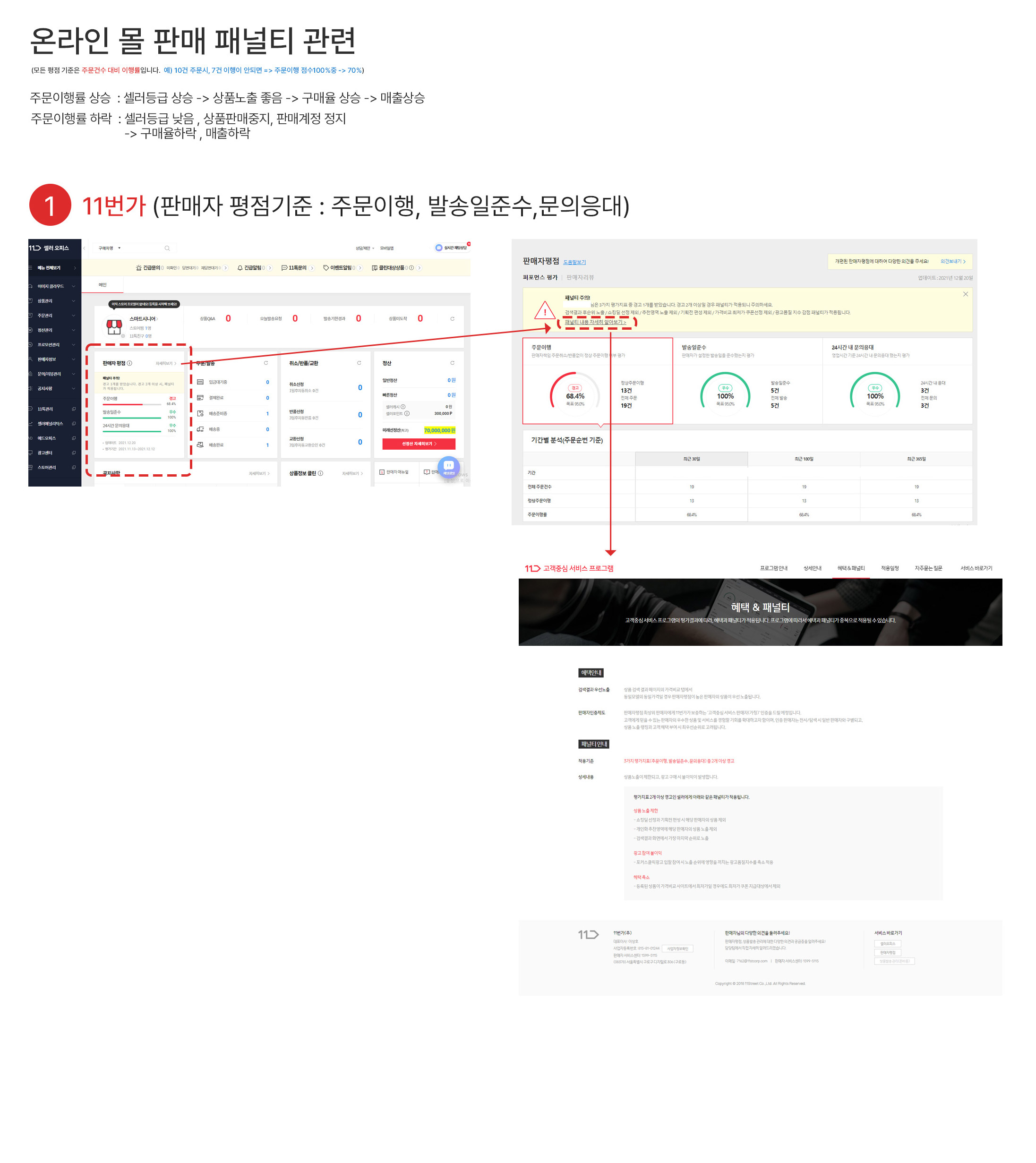 11번가는 관리자페이지 접속해서 보시면 판매자 평점 옆에 자세히 보기라고 있습니다. 그쪽을 클릭해보시면 어떤 사유로 페널티를 받게 되는지 자세한 내용이 기재되어 있습니다. 보통 주문 이행, 발송일 준수, 문의 응대 이렇게 크게 3가지로 구분되어 있네요.