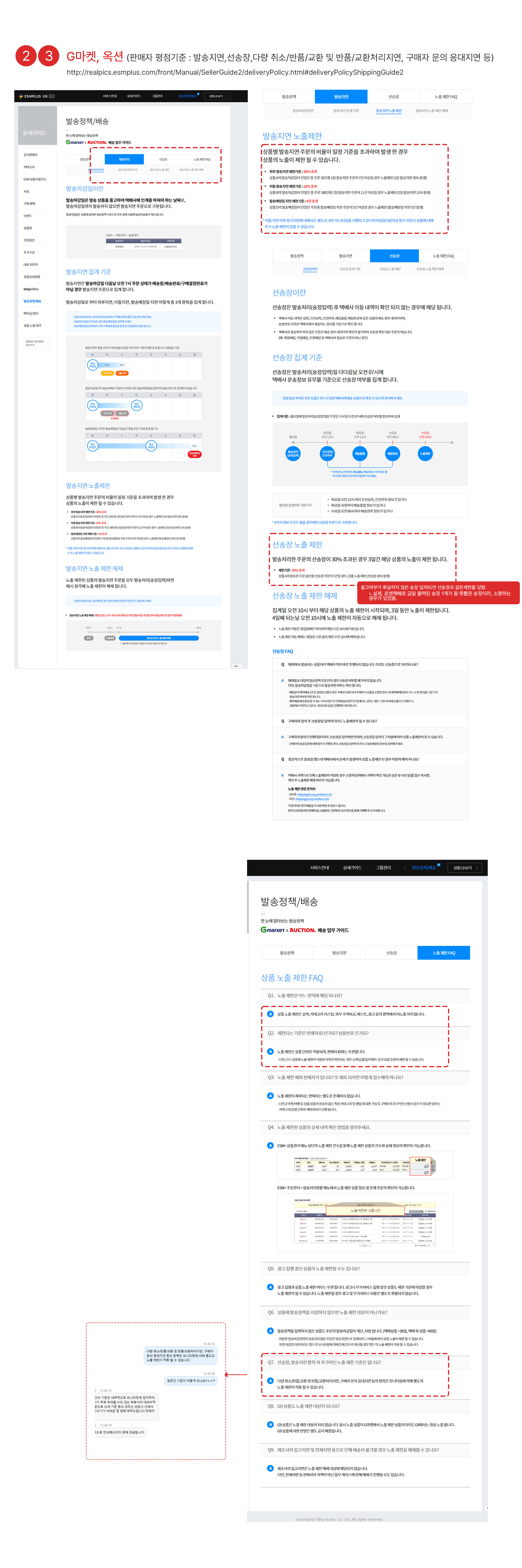 G마켓, 옥션은 사실 따로 있던 몰을 이베이가 인수하면서 두 가지 쇼핑몰 관리자가 합쳐졌는데요. 지금은 이마트가 인수했다고 합니다. 처음부터 다른 두 몰을 합쳤기 때문에 메뉴들이 각 탭으로 구분되어 있는데요. 발송 정책을 확인해보면 발송 지연, 선 송장, 다량 취소/반품/교환 및 반품/교환 처리 지연, 구매자 문의 응대 지연 등을 확인하네요. 기준에 보시면 다량의 취소/반품/교환 등이라고 표현된 '다량' 그러니까 다량이 정확이 어느 정도를 말하는 거냐 고객센터에 기준을 물어봤는데, 보시면 답변이 모호합니다. 그래서 페널티는 그냥 참고만 하시면 된다고 말씀드립니다.
